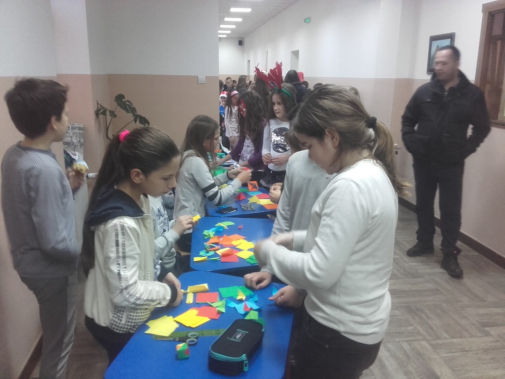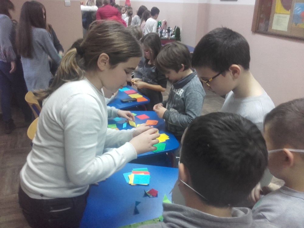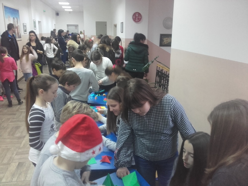 Шестаци су показивали млађим другарима као и свим посетиоцима, како могу направити украсе за јелку помоћу оригами технике .