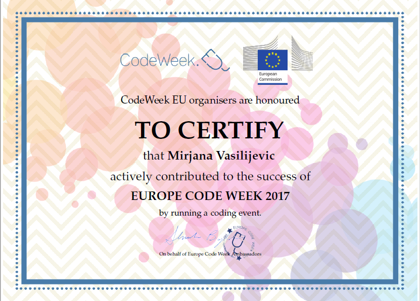 Посебно бих истакла Петра Николића ученика петог разреда и Јанка Стокића ученика седмог разреда који су на летњем распусту, уз забаву истражили команде програмирања и у овој,, Европској недељи кодирања” били ментори својим млађим или старијим другарима.