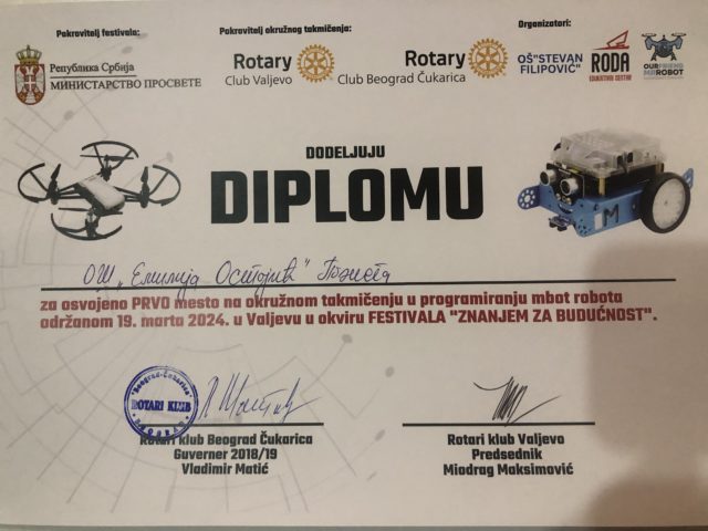 Екипа 2. освојила 1. место у категорији мбот робот серија 1. и пласирала се на републичко