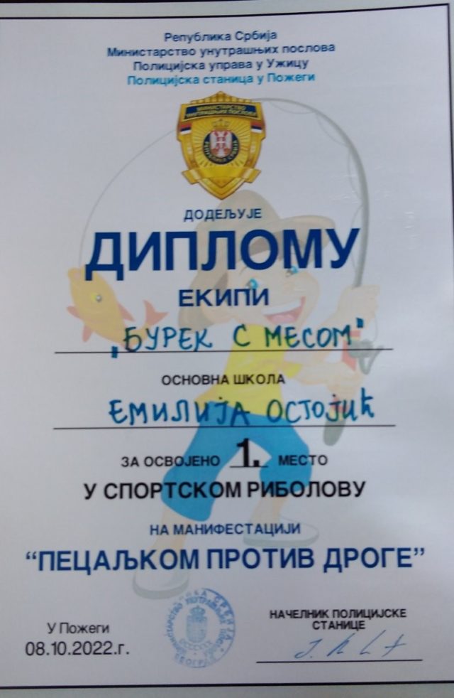 На такмичењу у спортском риболову „Пецаљком против дроге“,који је организовало Министарство унутрашњих послова, Полицијска управа Ужице, а које се одржало на Марића бари у суботу 8.октобра, група наших риболоваца,ученика VI 4, освојила је прво место. Саво Миросавић, Виктор Мићић и Вук Марковић чинили су победничку екипу „Бурек с месом“ и освојили пехар и медаље, на своју радост и велико задовољство наше школе. Честитамо!!!